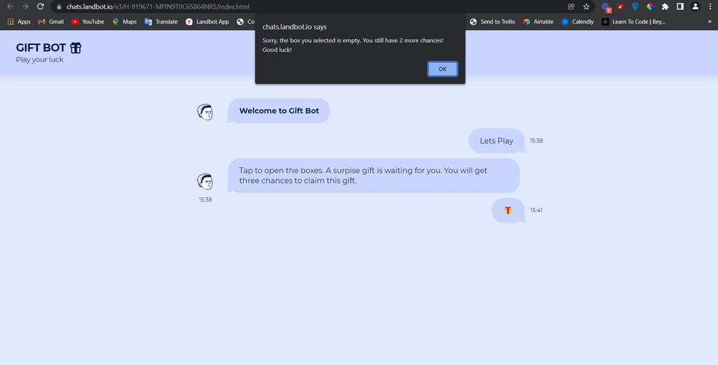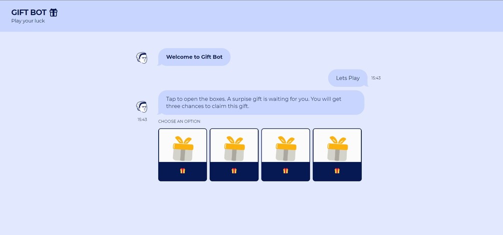 This is a demo of our work we did for a client for a campaign. This is called a gift bot. You can convert this bot idea in to free give away campaigns for your business or marketing your products. There are a lot use cases in marketing or running a special campaigns for lead generations. Have a look at this bot.